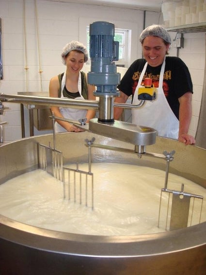 Again, what used to be hand stirring has become automated with our bigger batches of cheese. The paddles stir consistently and gently making sure the curd doesn't break as it cooks down into curds and whey. This process can take 30 minutes to several hours. As the curd is stirred, the vat is gently heated with water from the solar panels and the bacteria in the culture is given the right environment in the milk to thrive. When the target pH is reached, showing that the culture has done it's job, we whey off (remove the whey) and proceed to the next step. Whey is drawn off and disposed of one of three ways. Because it's rich in nutrients, it's either fed to the pigs, field applied to the pastures, or in some cases, fed back to the goats.